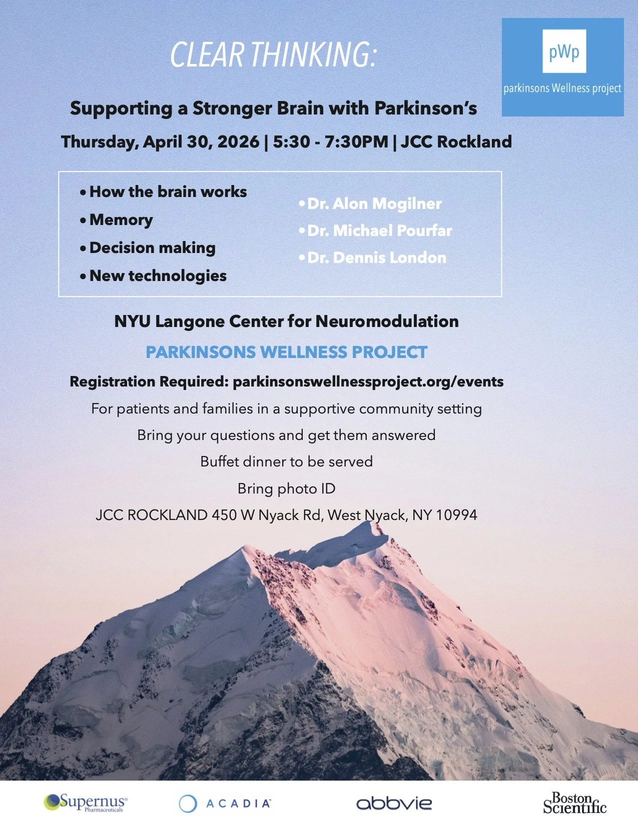 Leading experts from NYU Langone Center for Neuromodulation—Dr. Alon Mogilner, Dr. Michael Pourfar, and Dr. Dennis London—will present accessible, evidence-based insights on Deep Brain Stimulation (DBS) and High-Intensity Focused Ultrasound (HIFU), including who may benefit and what patients and care partners should know when considering these options.